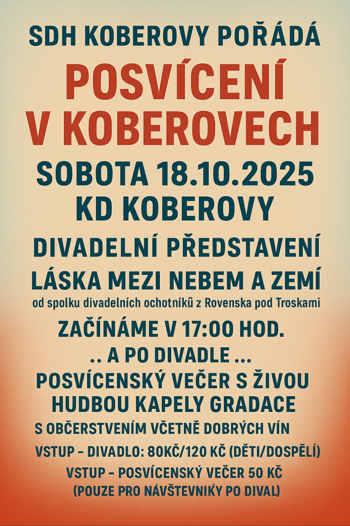 V sobotu 18. října 2025 se v Koberovech uskuteční divadelní představení 'Láska mezi nebem a zemí', které pořádá SDH Koberovy ve spolupráci se spolkem divadelních ochotníků z Rovenska pod Troskami. Akce začne v 17:00 hodin a po jejím skončení bude následovat posvícenský večer s živou hudbou kapely Gradace. K dispozici bude občerstvení včetně kvalitních vín. Vstupné na divadlo je 80 Kč pro děti a 120 Kč pro dospělé.