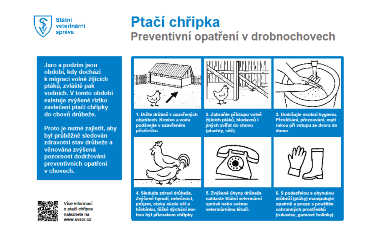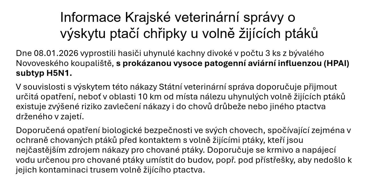 V souvislosti s výskytem vysoce patogenní aviární influenzy H5N1 v oblasti bývalého Novoveského koupaliště, doporučuje Státní veterinární správa chovatelům drůbeže přijmout preventivní opatření.