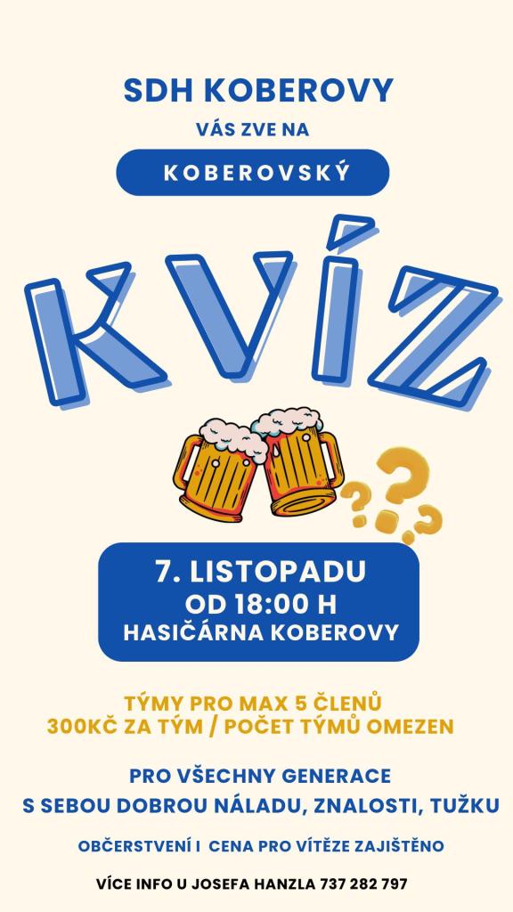 Srdečně vás zveme na Koberovský kvíz, který se koná v sobotu 7. listopadu 2025 od 18:00 v hasičárně Koberovy. Týmy mohou mít maximálně 5 členů a startovné činí 300 Kč za tým. Akce je určena pro všechny generace, proto si s sebou vezměte dobrou náladu, znalosti a tužku. Občerstvení a ceny pro vítěze jsou zajištěny. Pro více informací kontaktujte Josefa Hanzla na telefonním čísle 737 282 797.