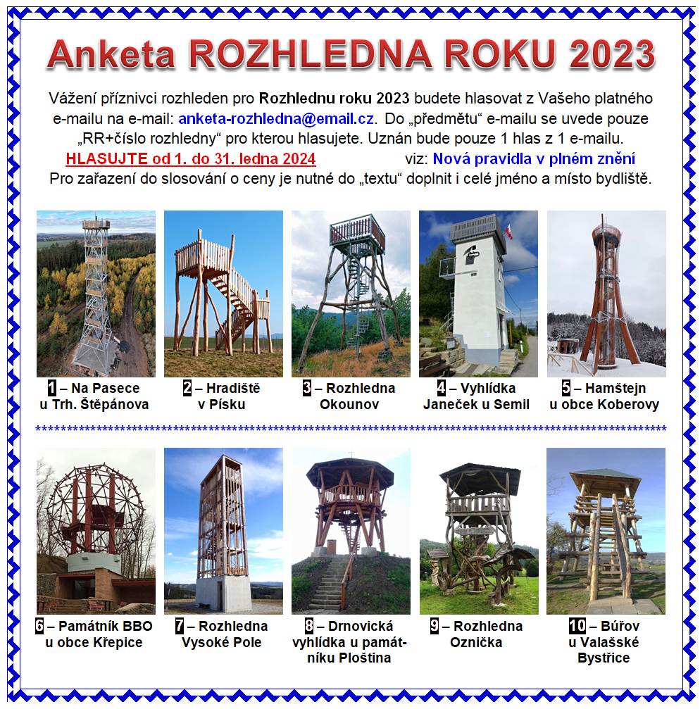 Klub přátel rozhleden, z.s. uspořádal hlasování od 01. do 31.01.2024 o rozhlednu roku 2023. Hlasovat můžete ze svého e-mailu na e-mail: anketa-rozhledna@email.cz, do předmětu e-mailu se uvede pouze RR+číslo rozhledny (RR+5). Uznán bude pouze jeden hlas z jednoho e-mailu.