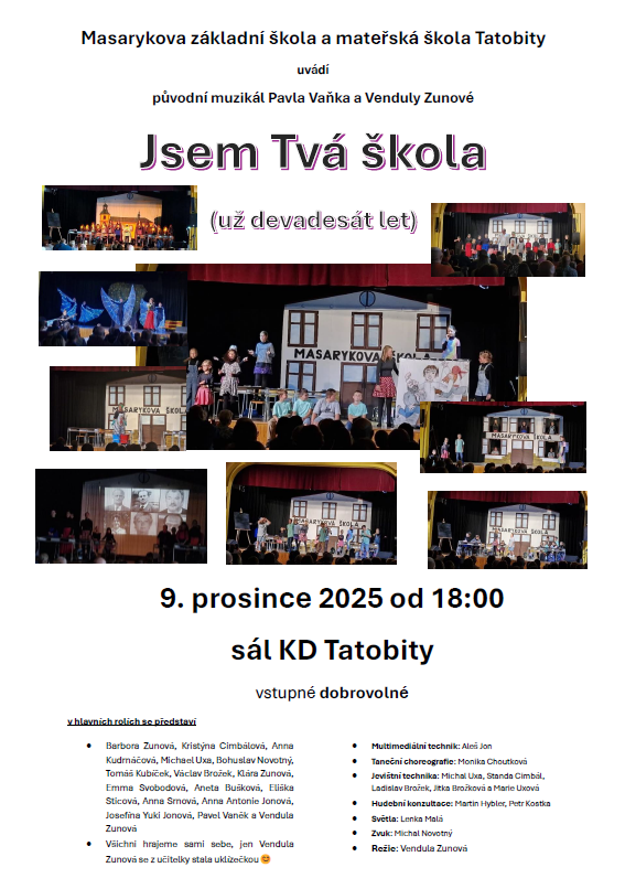Masarykova základní škola a mateřská škola Tatobity Vás zve 9. 12. 2025 od 18.00 hodin na představení JSEM TVÁ ŠKOLA, které se uskuteční v sálu KD Tatobity.