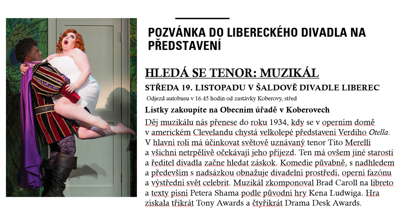 Zveme vás na muzikál Hledá se tenor, který se koná ve středu 19. listopadu 2025 v Šaldově divadle v Liberci. Odjezd autobusu je naplánován na 16:45 hodin od zastávky Koberovy, střed. Tento muzikál nás přenese do roku 1934, do operního domu v americkém Clevelandu, kde se chystá velkolepé představení Verdiho Orea. Děj s nadsázkou odhaluje divadelní prostředí a svět celebrit. Lístky jsou k zakoupení na Obecním úřadě v Koberovech.